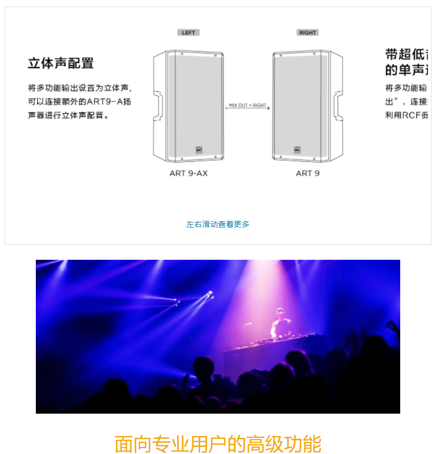 RCF最新推出了全新的ART9-AX係列,ART9-AX是一款具有48V麥克風前置放大器和線路輸入、內置6通道數字調音台和高級DSP、Bluetooth®(藍牙)流媒體和控製功能的兩分頻揚聲器。適用於任何音頻應用的頂級解決方案。