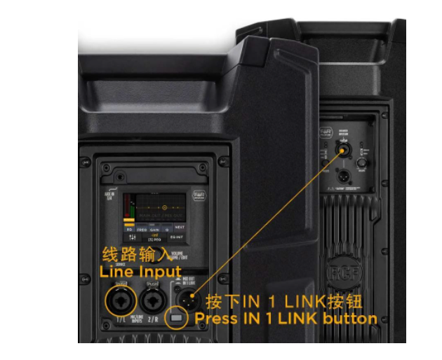隻需按下按鈕"IN 1 LINK",輸入1/L上的信號就會直接發送到輸出端。用於為其他揚聲器提供信號。