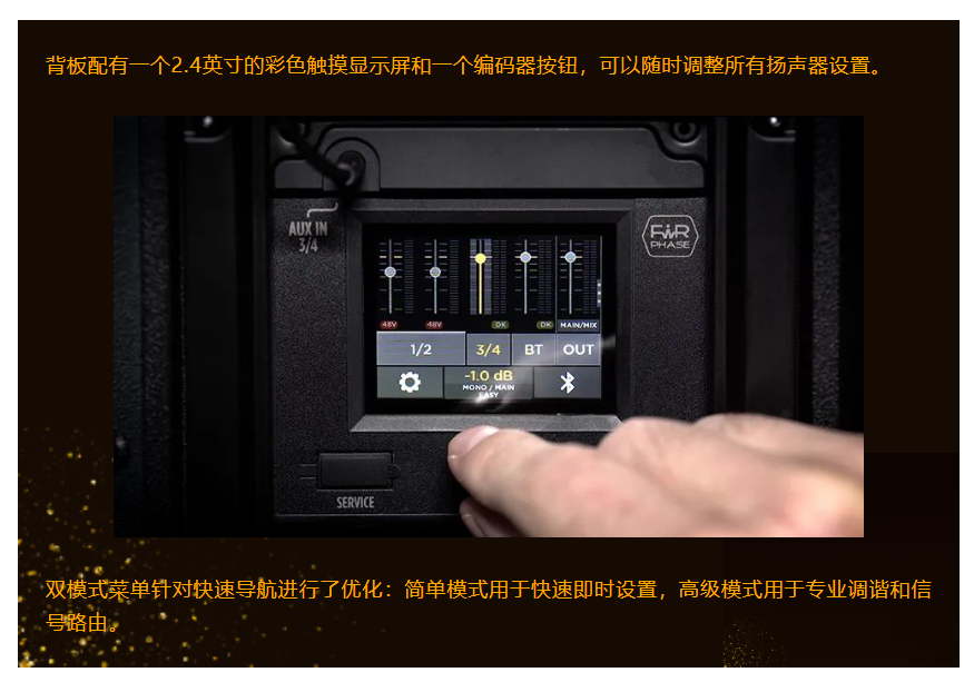通過藍牙和基於觸摸的彩色顯示屏進行遠程音頻和控製,可全麵管理以下內部功能: